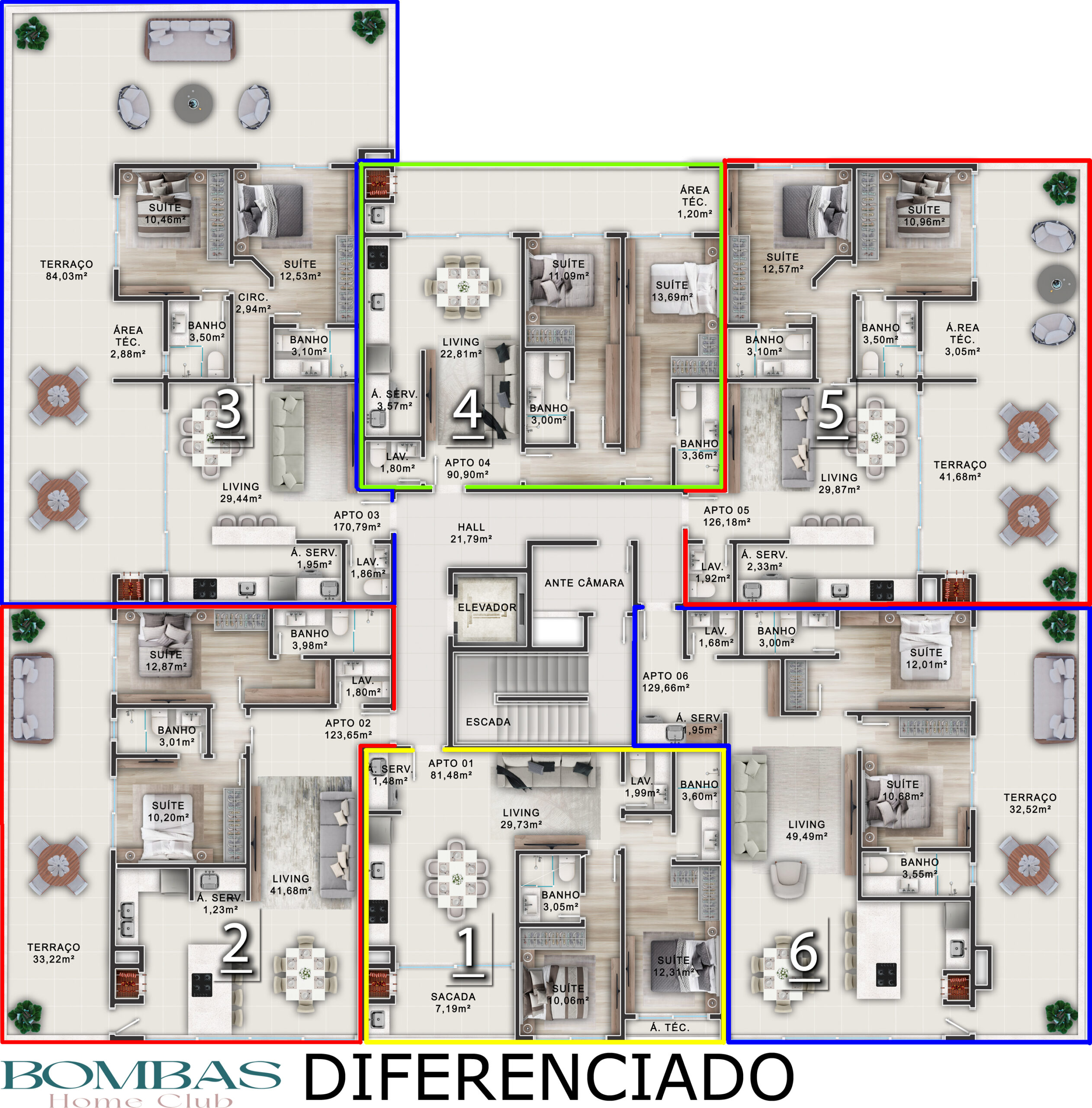 Uma planta diferenciada, com metragem maior, pois possui um amplo terraço. Esse terraço você pode organiza-lo a seu modo. E é entregue com toda infra para instalação de Jacuzzi.